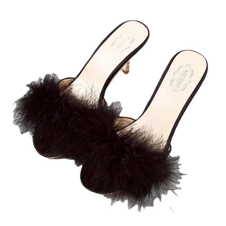 여성 여름 새로운 패션 털이 많은 스틸레토 샌들 단어 드래그 오픈 발가락 착용 하이힐 슬리퍼
