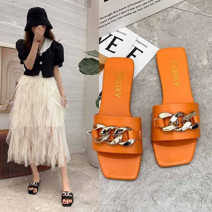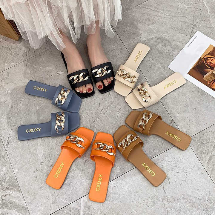 여성 여름 스퀘어 발가락 체인 슬리퍼 플랫 슬라이드 샌들 비치 캐주얼 신발 숙녀